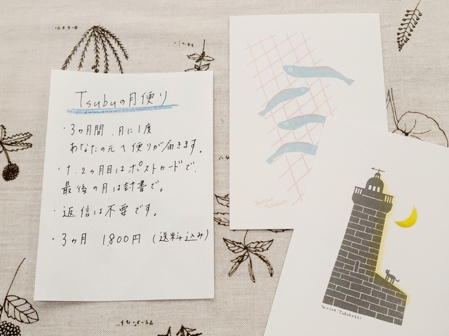便りを待つ時間に、何を思いますか。 ポストを開けたとき、どんな灯りがともりましたか。 Tsubuの月便りは、 月に一度、ささやかな便りをお届けする 三ヶ月間の小さな試みです。 ポストカードを中心に、 最後の月には封書でお届けします。 日々のこと、 本のこと、 季節のこと。 特別なことは書きません。 けれど、読んだときに心が少しゆるむような、 そんな静かな便りでありたいと思っています。 返信は不要です。 ただ、受け取っていただくだけ。 三ヶ月間 1,800円(送料込み) 【流れ】 ① BASEでお申し込み(ご購入) ② 店主より始めのお便りをお送りします。。 ・お申し込み後、3営業日以内に投函します。 ・投函後、発送完了メールをお送りします。 ・この時点でキャンセルはお受けできなくなります。 ③ 三ヶ月間、月に1度のお便りをお待ちください。 ・1回目、2回目はポストカードで。最後の月は封書でお届けします。