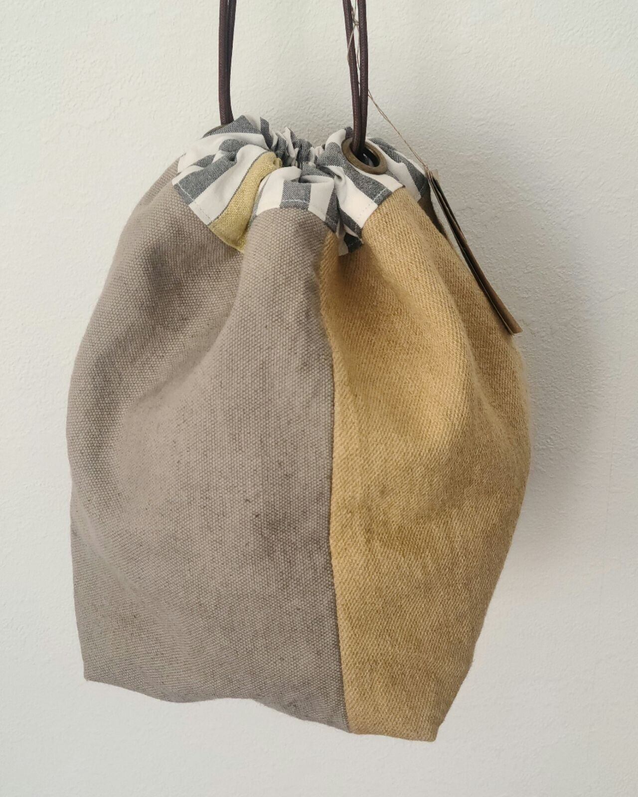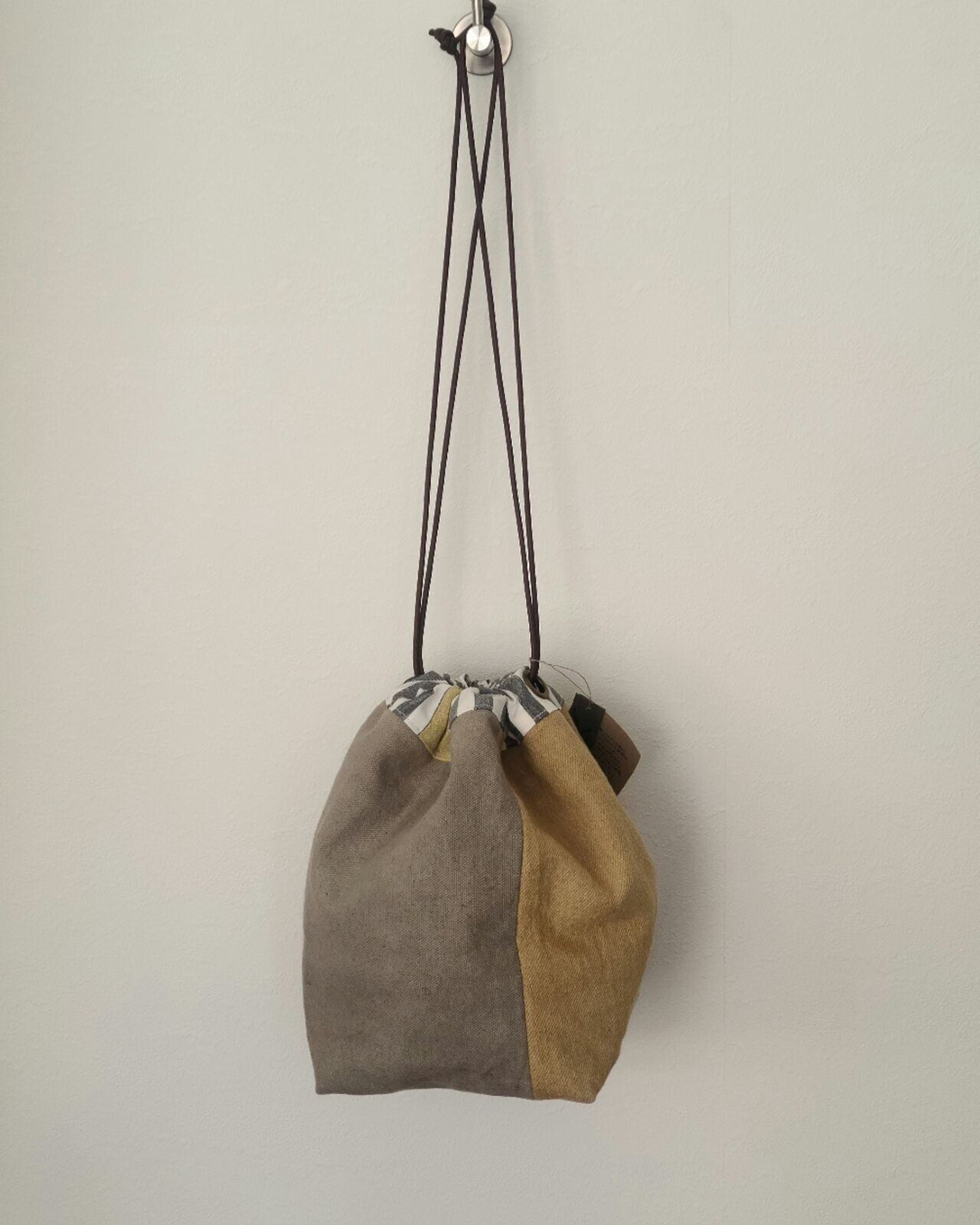 素材や色の違う布を縫い合わせて作られた紙風船のような巾着バッグです。